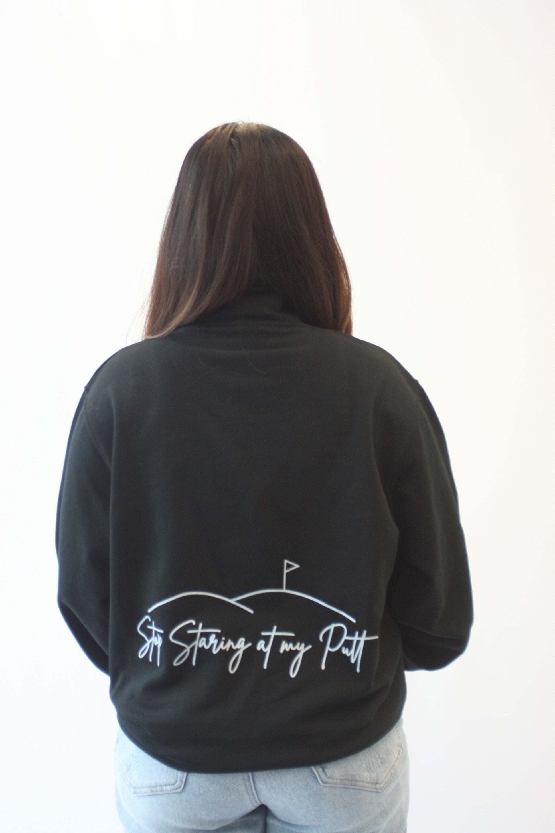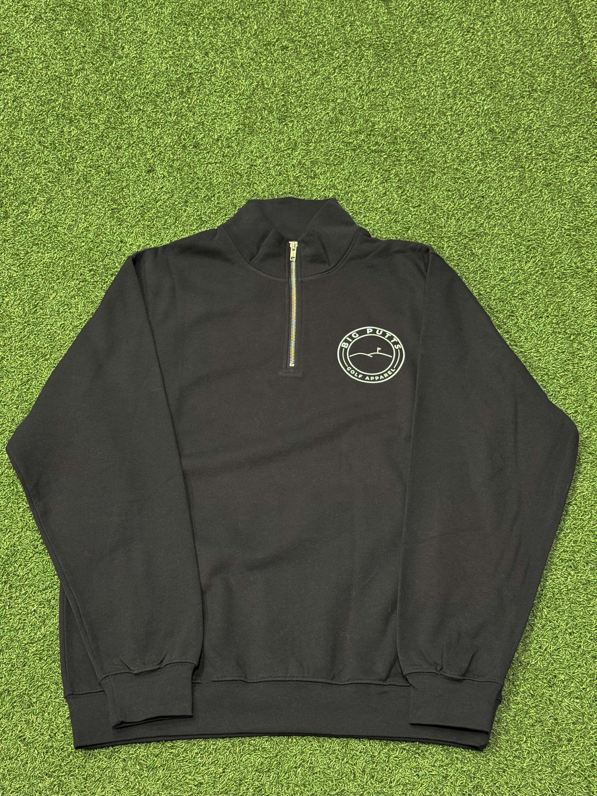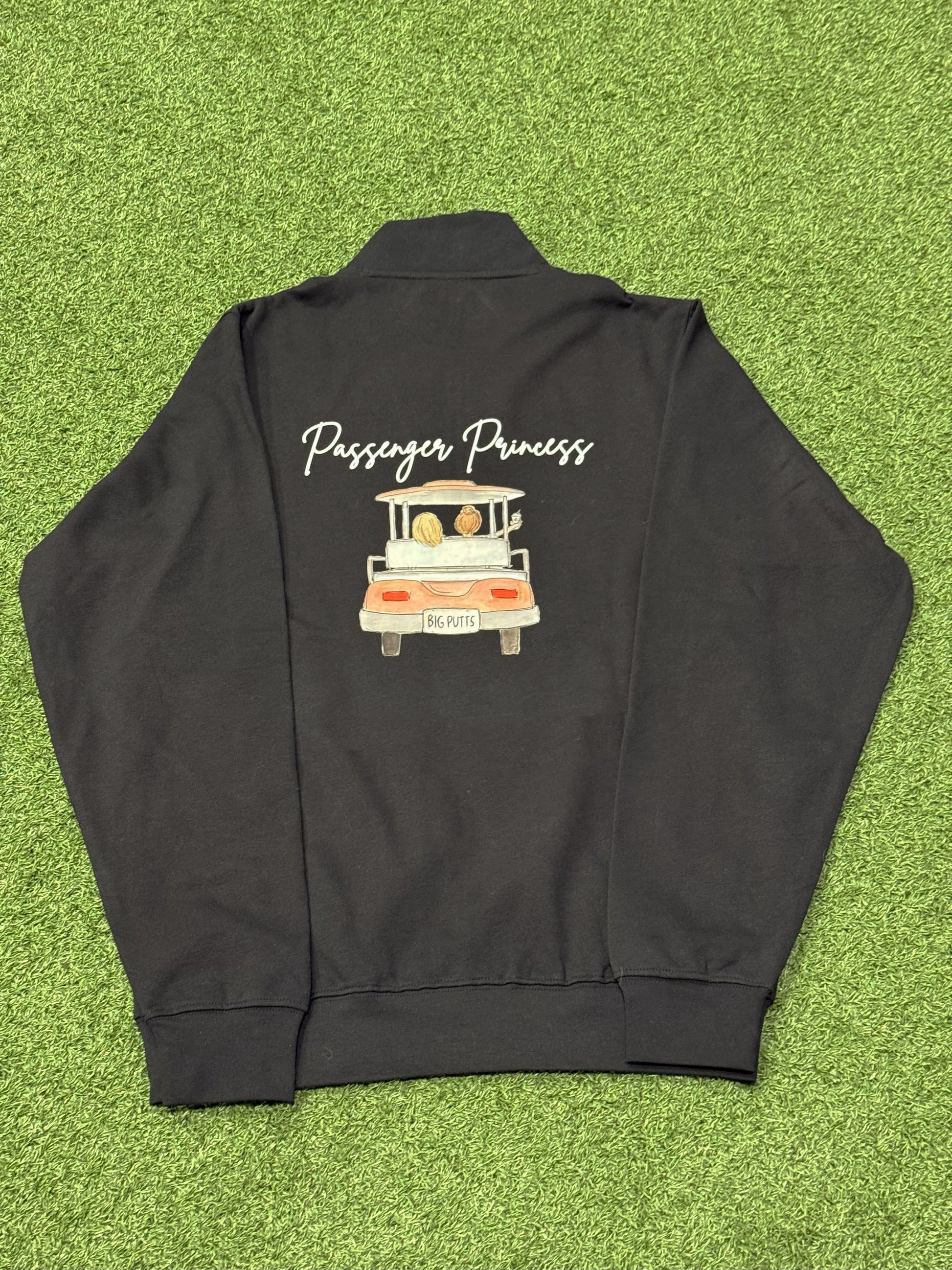 This Custom 1/4 Zip Sweatshirt in classic black offers both comfort and style, perfect for those cooler days on and off the course. Made from a soft, durable fabric, it features a sleek 1/4 zip design for adjustable ventilation and a modern fit. Choose from three playful, bold designs—Stop Staring at My Putts (with script Big Putts on front), Passenger Princess (with script Big Putts on front), or the Simply Big Putts Badge Logo—to add your own personal touch. Whether you're lounging after a round or warming up for your next swing, this sweatshirt provides all-day comfort with a touch of humor and personality.